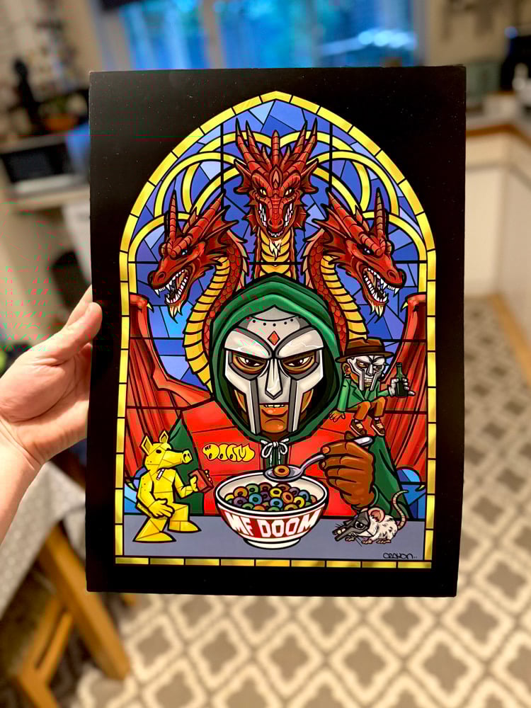 To celebrate the icon in the metal mask , I made this A3 stain glass window illustration . It’s a super limited run as always - just 70 of these will ever be printed. The first 30 orders will come with a free DOOM keyring and I got free stickers for everyone who orders 😉